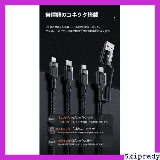 【高品質素材】:太くする銅製コアを採用し、伝導面積を増やし、抵抗を減らし、6Aの電流を簡単に流します。高質感なアルミ合金とTPE外装を採用し、耐指紋・耐摩耗性・速い放熱性・堅牢軽量などの特性を持ちます。本体は強靭なナイロン編みと高密度配線構造を採用し、30000以上の厳しい折り曲げ試験を耐え、ケーブルの柔軟性と耐屈曲性が強いです。【非常に便利さ】:このケーブルの長さは約1.2mです。メインケーブルの長さは約70cmです。サブケーブルの長さは約50cmです。より快適にお使いいただけます。【高速充電のロゴ付き】:各ポートで出力のワット数をレーザー彫刻、各対応した最大出力を(Type-Cポート 100W、ライトニングポート20W、Micro USBポート 18W)を表示られます。【ケーブル長さの調節器】:分離されたスルーホールのデザインにより、ケーブルの長さを簡単に調整できまます。