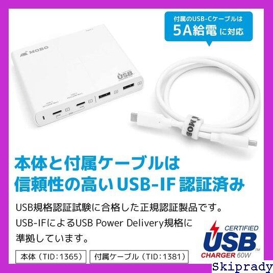 ノートパソコン・タブレット・スマホが同時に充電できるMOBO「Dual USB-C MultiPort USB AC Adapter」ノートパソコンからスマホまでコンセント1つで■USB-C、USB-Aをそれぞれ2ポートずつ搭載。1台で同時に4台の機器を充電できるので、複数の充電器を持ち歩く必要はもうありません。■USB Power Delivery3.0対応 USB-Cx2ポート最大出力60Wと30WのUSB PD出力に対応したUSB-Cポートを搭載。ノートパソコンやタブレットが同時に充電可能。急速充電(18W)対応のiPhoneなら、付属の充電器に比べて、約半分の時間で充電。USB-A 2ポートも搭載しており、2ポート合計36Wまでの出力に対応。■本体と付属ケーブルは信頼性の高いUSB-IF認証USB規格認証試験に合格した、認証製品。USB-IFによるUSB Power Delivery規格に準拠。(TID:1365)付属のUSB-Cケーブルは5A給電に対応。付属のケーブルも、USB規格認証試験に合格した、認証品。(TID:1381)■自動で最適な電力を供給USB-Cポートを使用して充電する場合は、充電する機器の仕様に合わせて、自動で最適な電力を供給。■様々な保護機能と安全な回路設計過充電制御・過電流保護・ショート防止・温度過昇防止の機能を搭載しているので、安心してご利用いただけます。■薄型で持ち運びらくらく2cmという薄さでカバンのポケットにも収納可能。AC100V-240V対応で、海外旅行や出張にも便利です。■LEDインジケーター充電器本体への通電状態が確認できるLEDインジケーターを搭載しています。点灯時は、USBポートから各USB電源機器への充電が可能です。■5A対応 USB-Cケーブル 付属ケーブル長:約1mコネクタ形状:USB-Cオス to USB-Cオス規格:USB3.1 Gen2・USB Power Delivery 対応 最大 DC20V/5Aその他:USB-IF認証取得品■MFi認証 TypeC to ライトニングケーブル 付属ケーブル長:約1mコネクタ形状:USB-Cオス to ライトニング